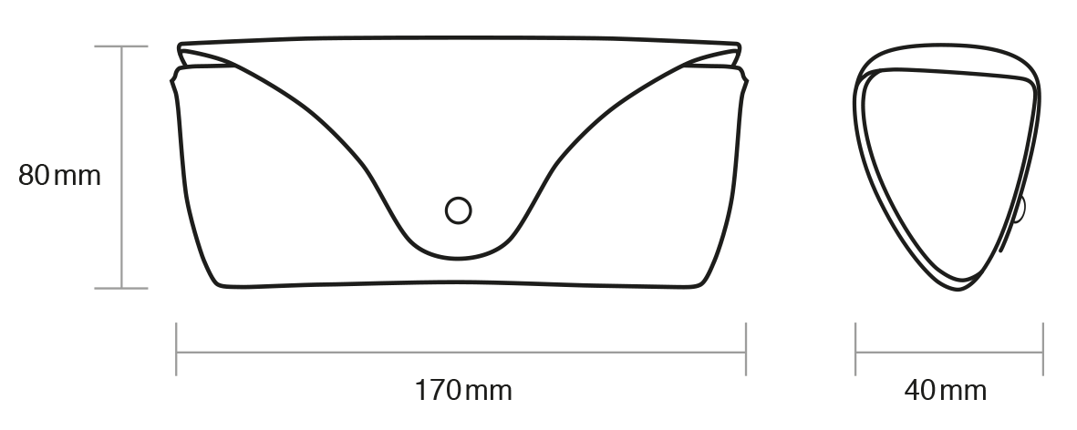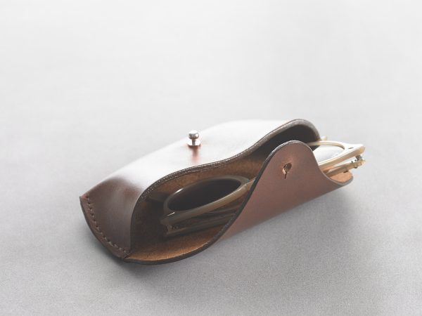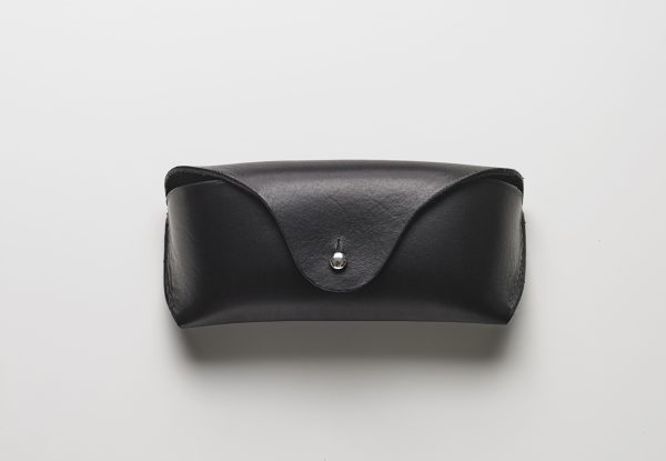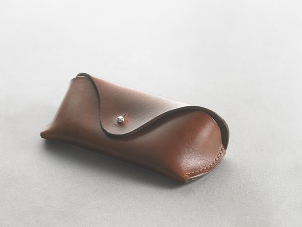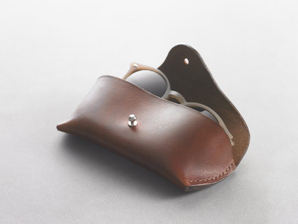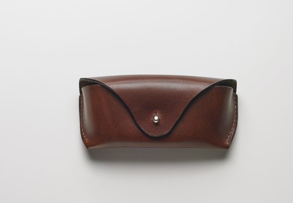 Made from one piece of thick leather with minimal hand stitching. The closure is sandwiched between a thinner piece of leather on the inside that protects the glasses and helps keep the shape of the case.